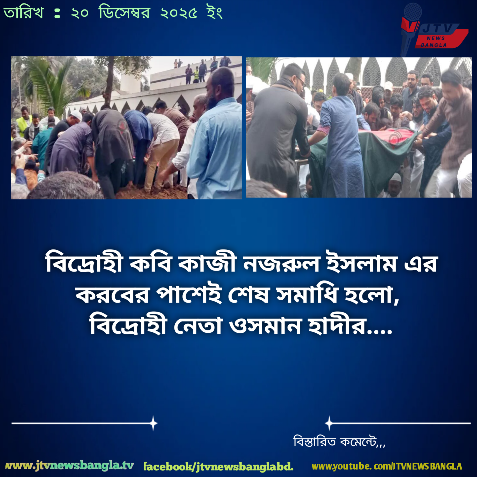 বিদ্রোহী কবি কাজী নজরুল ইসলাম এর করবের পাশেই শেষ সমাধি হলো,বিদ্রোহী নেতা ওসমান হাদীর। জেটিভি নিউজ বাংলা, স্পেশাল